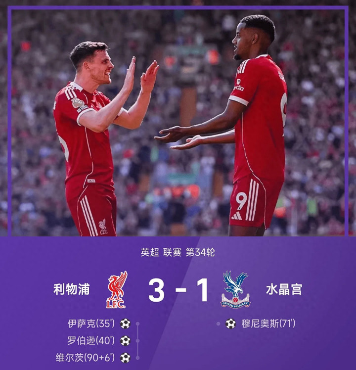 4月26日25/26赛季英超联赛第34轮,利物浦主场迎战水晶宫。上半场,伊萨克扫射破门打进复出后首球,琼斯直塞,罗伯逊破门扩大领先,伍德曼奉献精彩扑救;下半场博彩网站排名,萨拉赫受伤被换下,穆尼奥斯争议破门扳回一球。维尔茨最后时刻破门锁定胜局,最终,利物浦主场3-1战胜水晶宫,英超三连胜,积分来到58分,升至第四位。